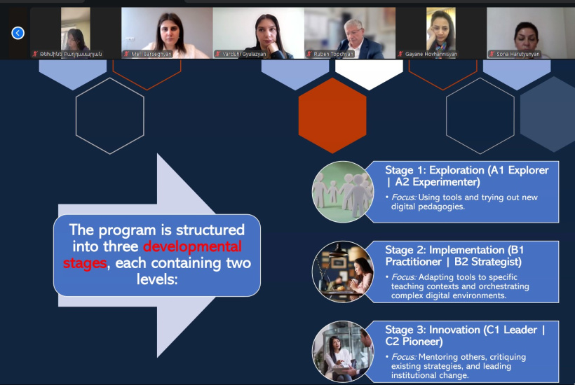 The opening speech was delivered by the program coordinator, Armen Budaghyan, who emphasized the strategic significance of the program, noting that the introduction of a unified accreditation mechanism at the national level will contribute to improving the quality and sustainable development of digital education in Armenian universities. The objectives and expected outcomes of WP2 were presented by Gayane Hovhannisyan, International Cooperation and Program Coordinator at the Armenian State Pedagogical University. Subsequently, Tigran Mikaelyan, Dean of the Faculty of Foreign Languages at the same university, presented the strategic architecture of the national accreditation program for digital teaching, learning, and assessment, as well as the structure of the teacher retraining program, addressing its implementation phases and practical application mechanisms. European partner universities, specifically, the Autonomous University of Madrid, University of Genoa, University of Lisbon, and the Royal Institute of Technology, shared their experience in the field of digital education and accreditation.